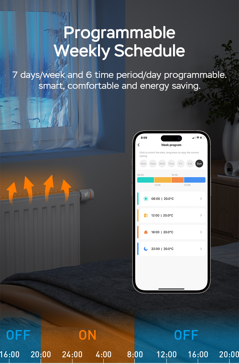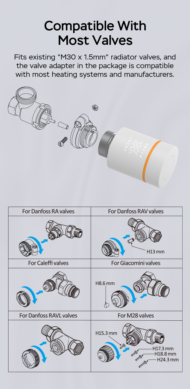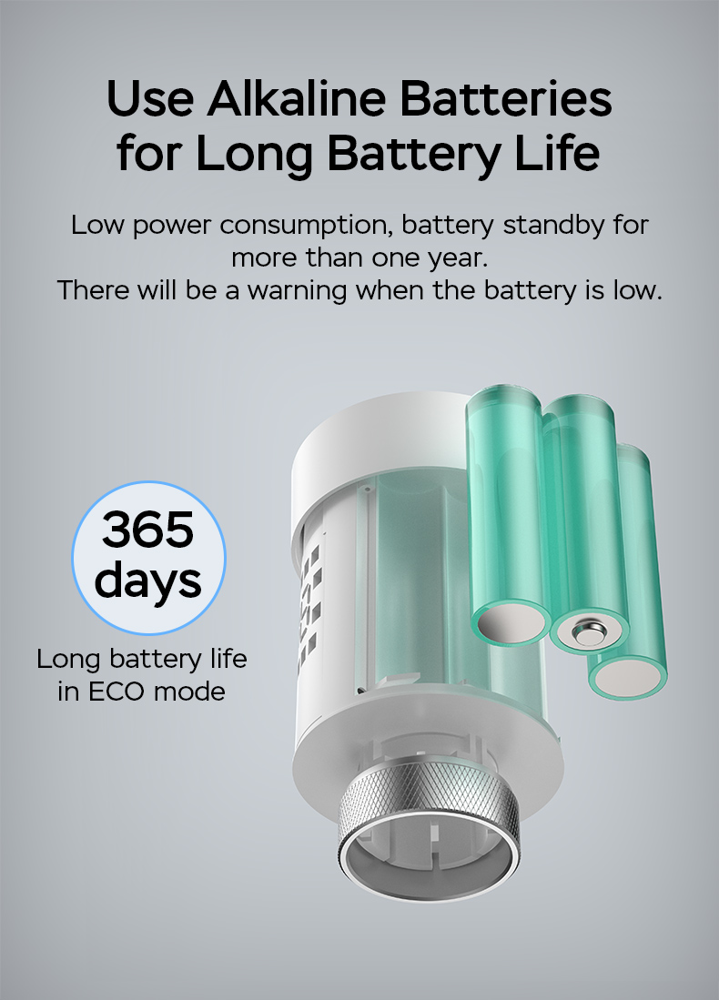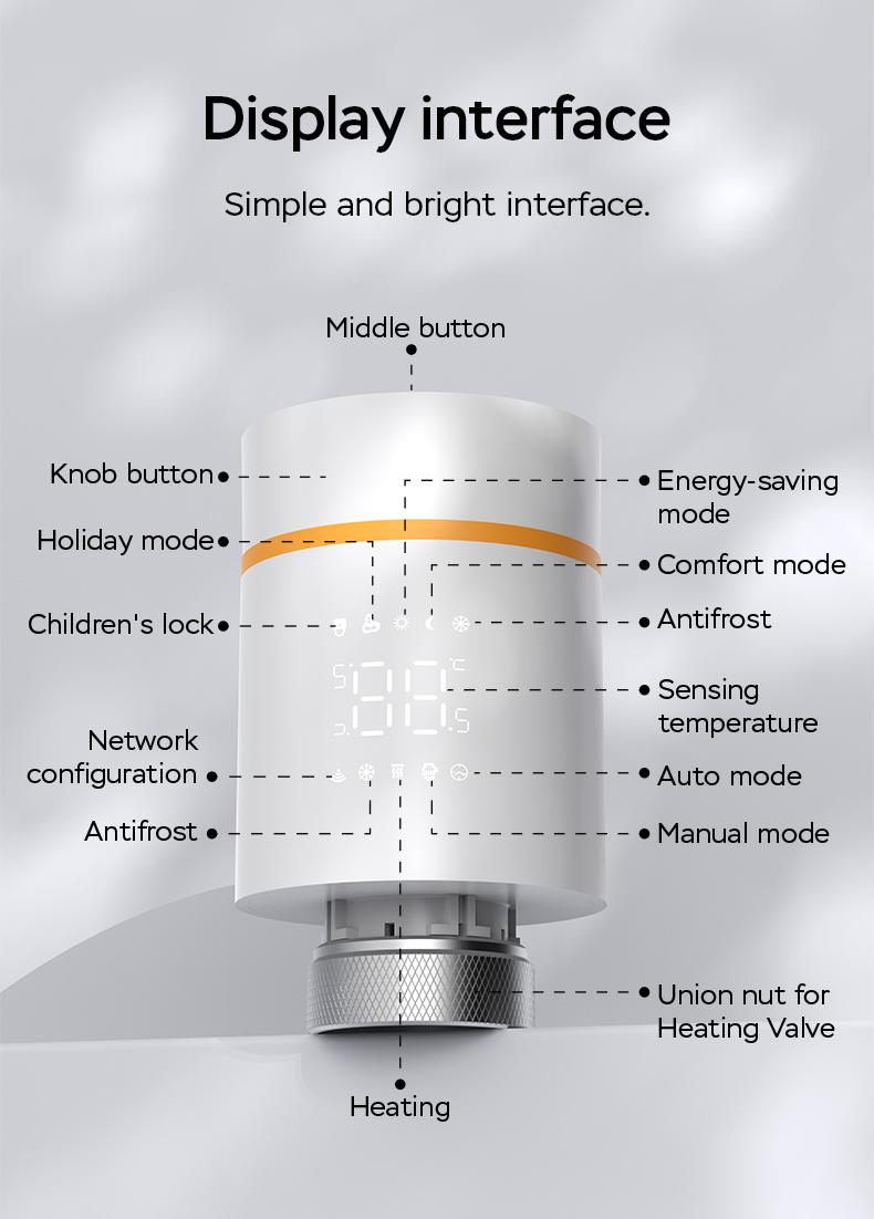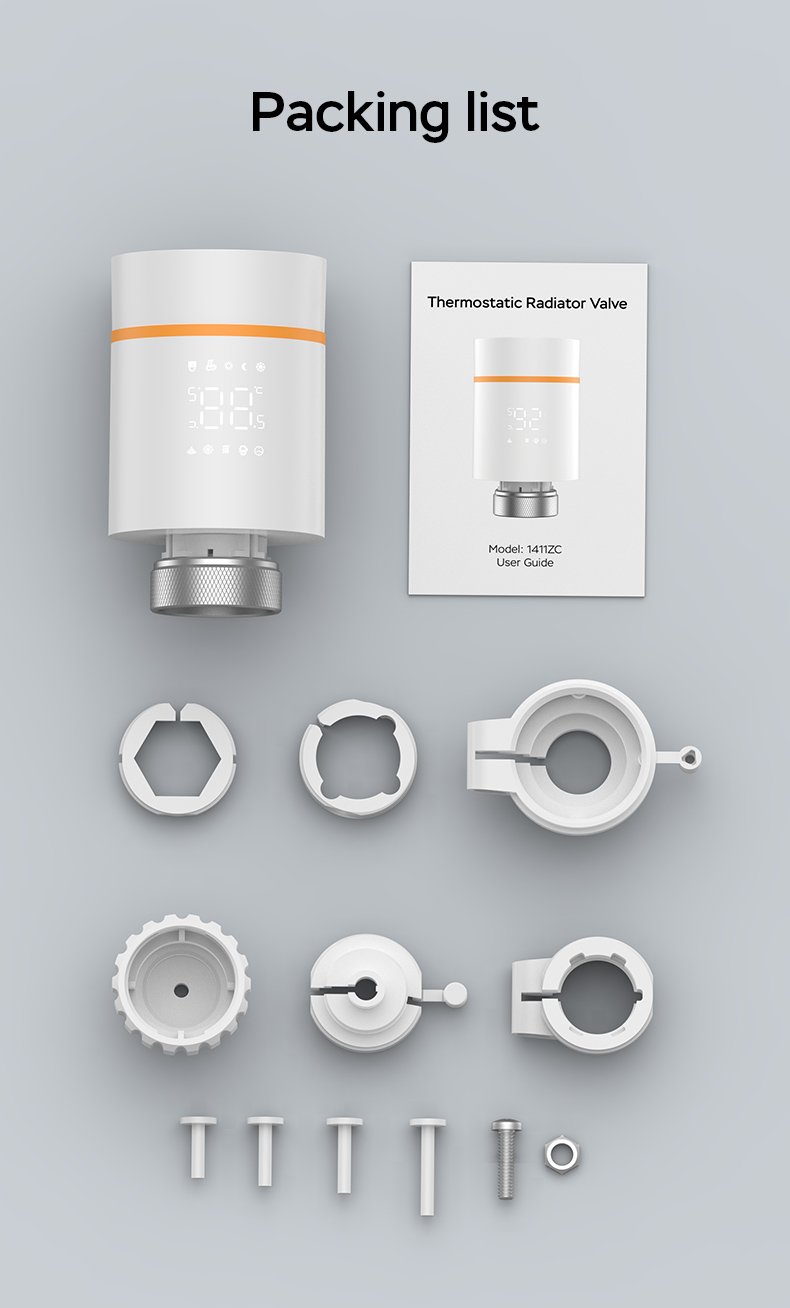 The Thermostatic Radiator Valve uses an alkaline battery to control the temperature of a water-he ated radiator. It requires no wiring and is easy to install. While providing a comfortable temperatu- re, it reduces energy waste and saves users hea- ting costs. The built-in low-power Zigbee wireless communication module and LED display light can be used alone or combined with theTUYA APP to become a smart thermostat, which can be set and viewed in the APP. After the network is configured successfully, you can set it in the APP, and the de- vice and APP are automatically synchronized.